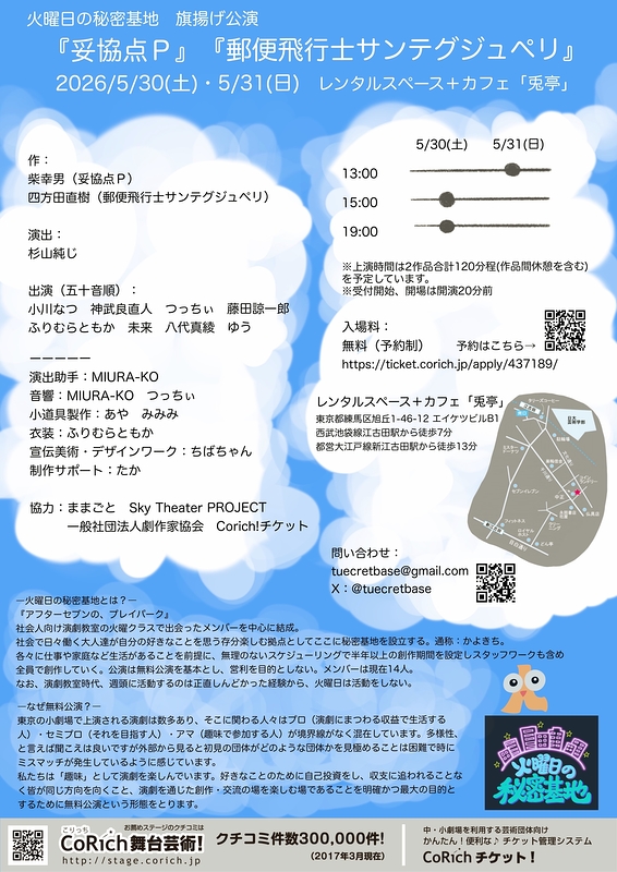| スタッフ | 演出助手:MIURA-KO 音響:MIURA-KO つっちぃ 小道具製作:あや みみみ 衣装:ふりむらともか 宣伝美術・デザインワーク:ちばちゃん 制作サポート:たか 協力:ままごと Sky Theater PROJECT 一般社団法人劇作家協会 Corich!チケット |